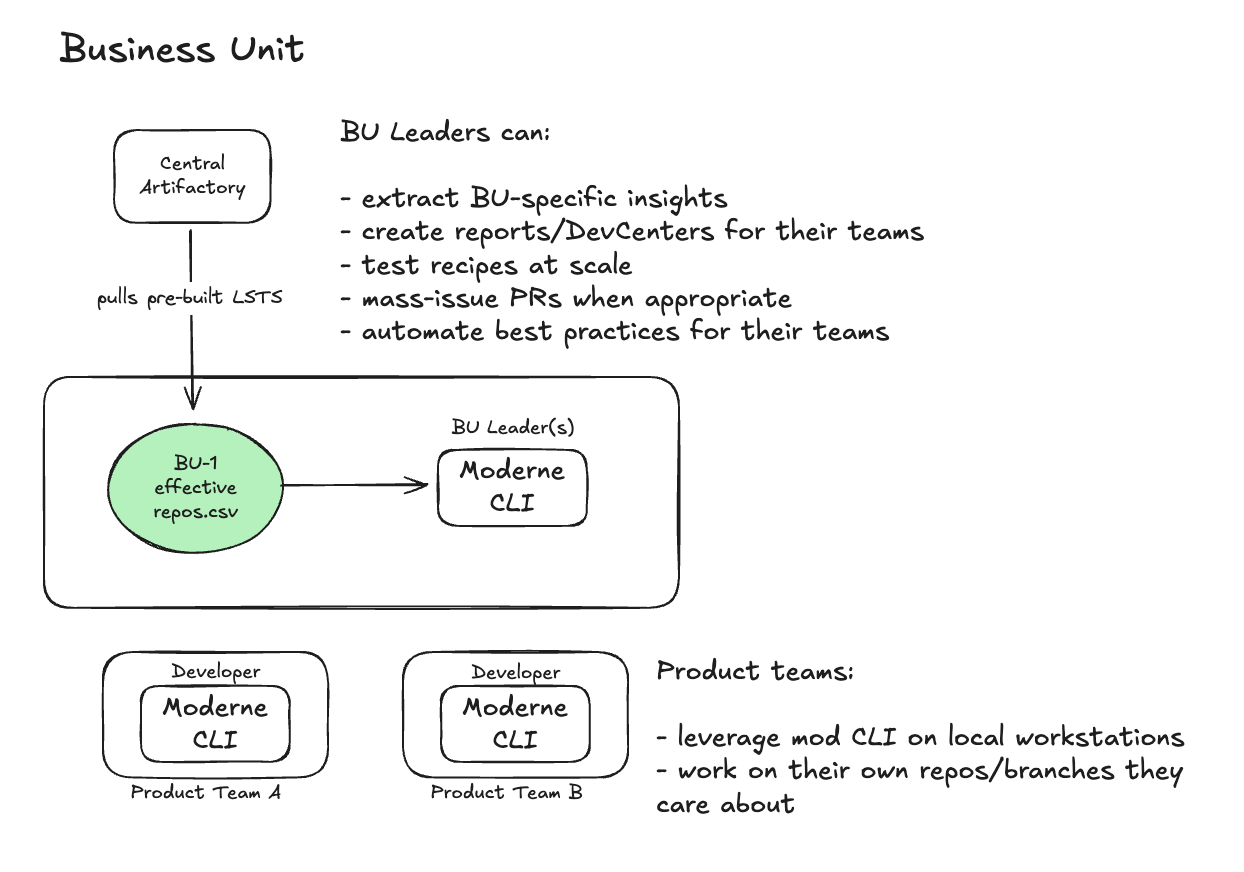 repos.csvfiles your business units have created. It then builds the LSTs for each of these repositories - which the Moderne CLI will use to run recipes against. - It produces an effective