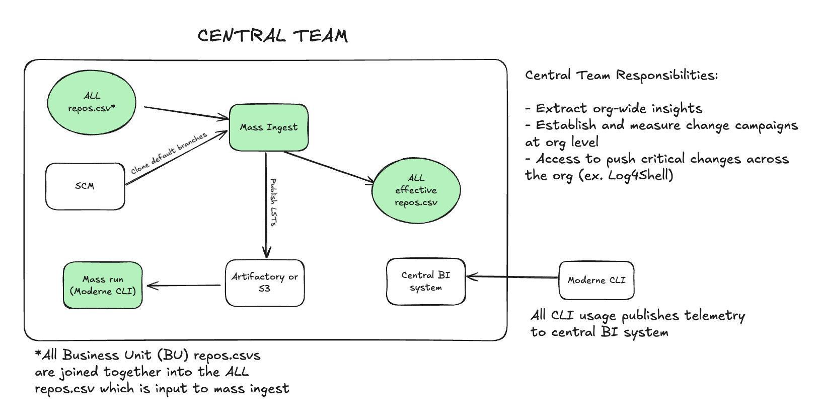 It is very important that a central team owns mass ingest. This is because, when onboarding new teams, you don't want to have to wait for their repos to build and be published. With a central team owning it all, any time you onboard someone new, their LSTs and publish locations will already be available in the easily shareable effective repos.csv file.