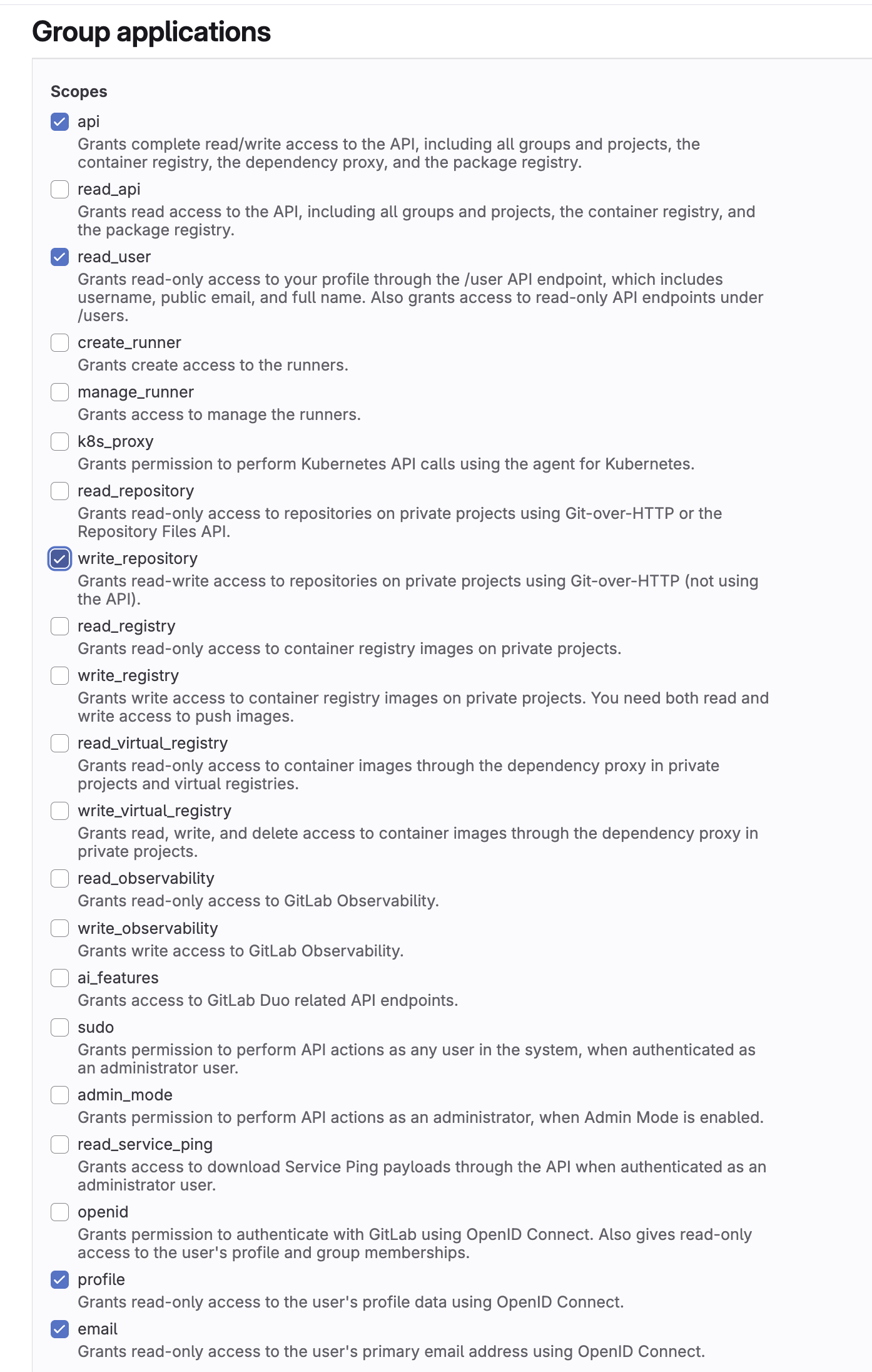 write_repository | Yes | Used to push commits to repositories via Git-over-HTTP. This scope does not grant API write access — it only allows git push. |