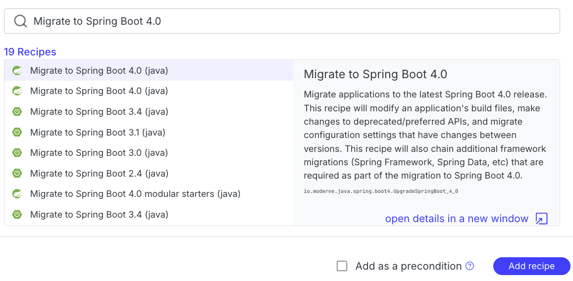 Migrate to Spring Boot 4.0(io.moderne.java.spring.boot4.UpgradeSpringBoot_4_0) and select it. - Click