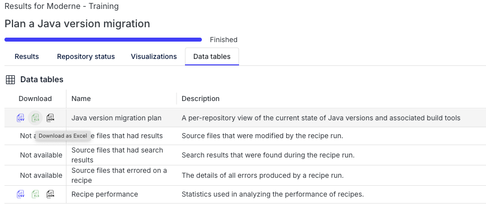 Data tablestab. Then download and open theJava version migration plandata table as a CSV or Excel file.