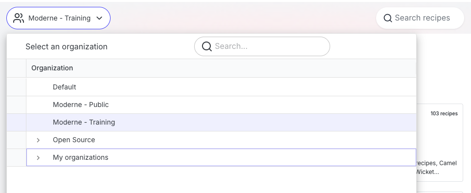 Moderne - Trainingis still selected in the org dropdown. - Click