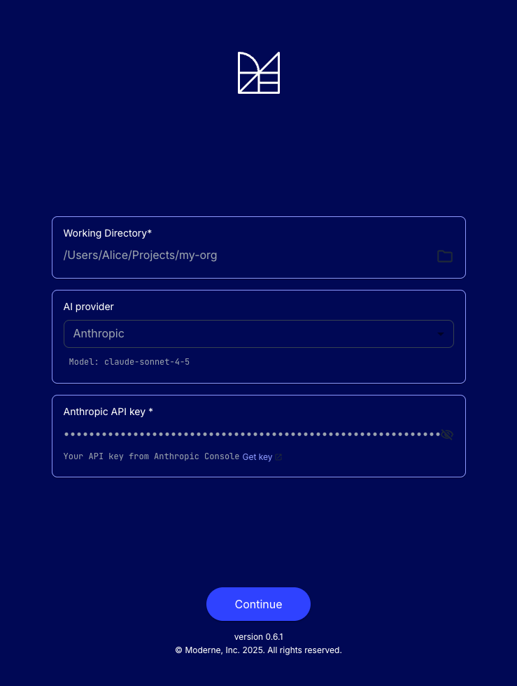 When you first launch Moddy, you will be prompted to fill in an API key from your chosen model provider (Anthropic, OpenAI, or Gemini) and to provide a working directory. The working directory should be the directory that contains all of the repositories you wish to ask questions about or run recipes against. You can change this after the fact as desired.