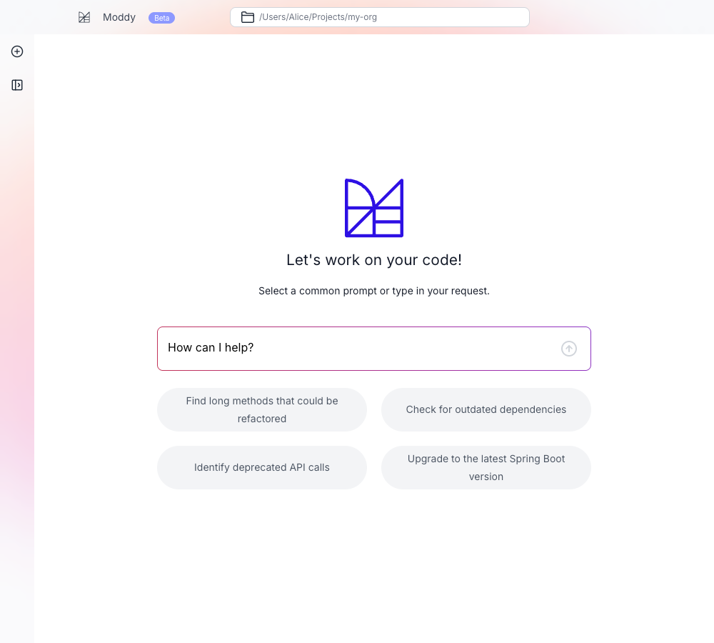 Moddy Desktop is a standalone version of Moddy that runs on your local machine. This allows you to quickly run it against your local repositories or connect to other tools such as Claude code through an MCP connection. We also offer a web-based Moddy – which runs inside the Moderne Platform so that you can run requests against thousands of repositories at once.