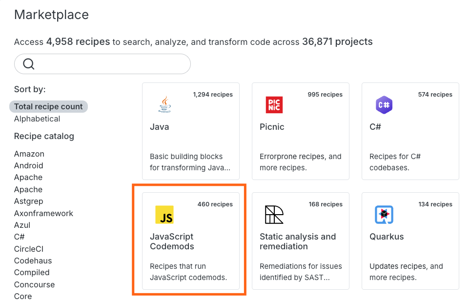 You can find all of the Moderne codemods in the Moderne marketplace under the JavaScript Codemods section: