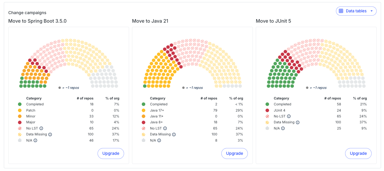 The change campaigns section is useful for tracking how your organization is doing at keeping your code up-to-date with the latest versions. These cards are configured by the organizational administrator and specifically chosen to align with that organization's needs.
