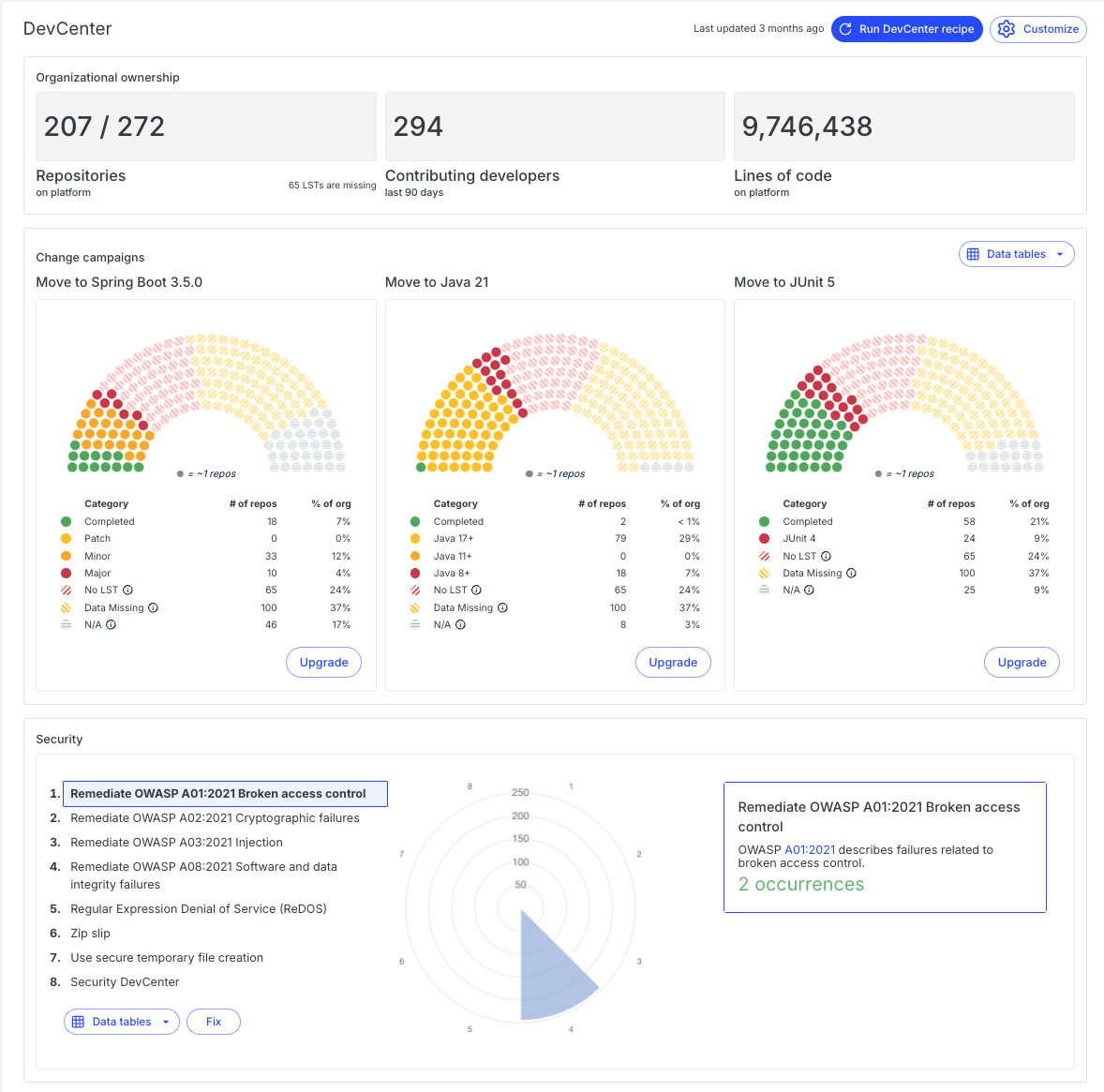 The Moderne DevCenter is the mission-control dashboard of the Moderne Platform. It provides you with high-level details about the state of all of your repositories. Using it, you can track the progress of upgrades, migrations, and security vulnerabilities.