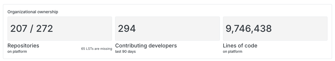 The organization ownership section gives you a high-level view of your organization. It tells you how many repositories the organization is composed of, how many developers have contributed any amount of code to those repositories in the last 90 days, and how many lines of code have been ingested into the Moderne Platform. It will also let you know if any LSTs are missing in your artifact repository.