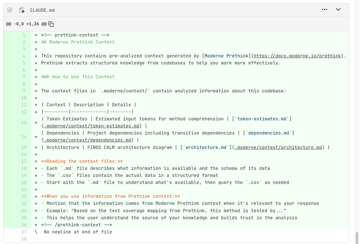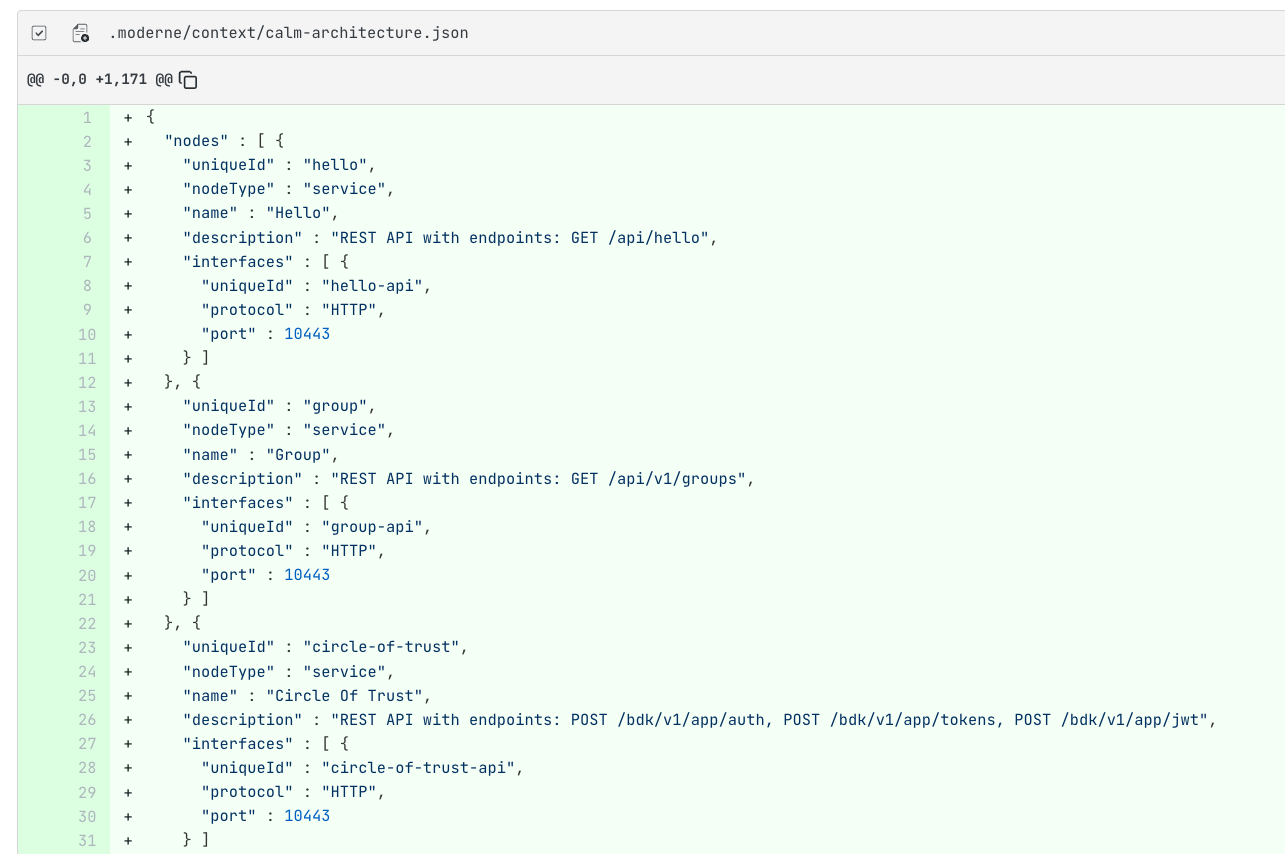 This recipe generates comprehensive context files - including AI-powered code comprehension, test coverage mapping, dependency inventory, and FINOS CALM architecture diagrams.