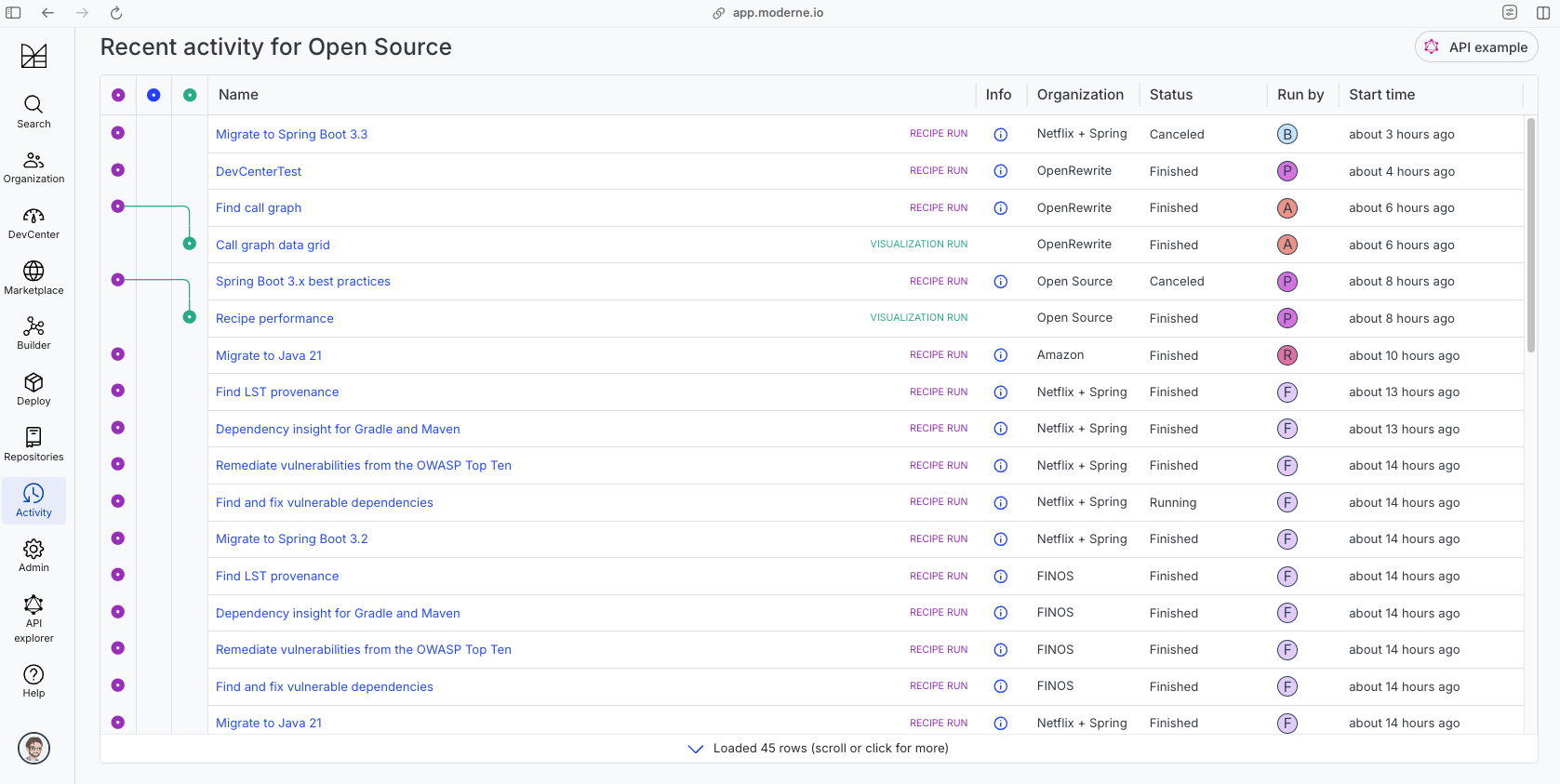 The community edition of the Moderne platform enables you to easily run recipes across thousands of open-source repositories.